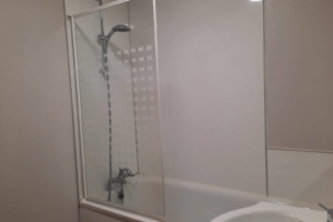 - Contemporary white bathroom suite with shower over bath & vanity wash hand basin